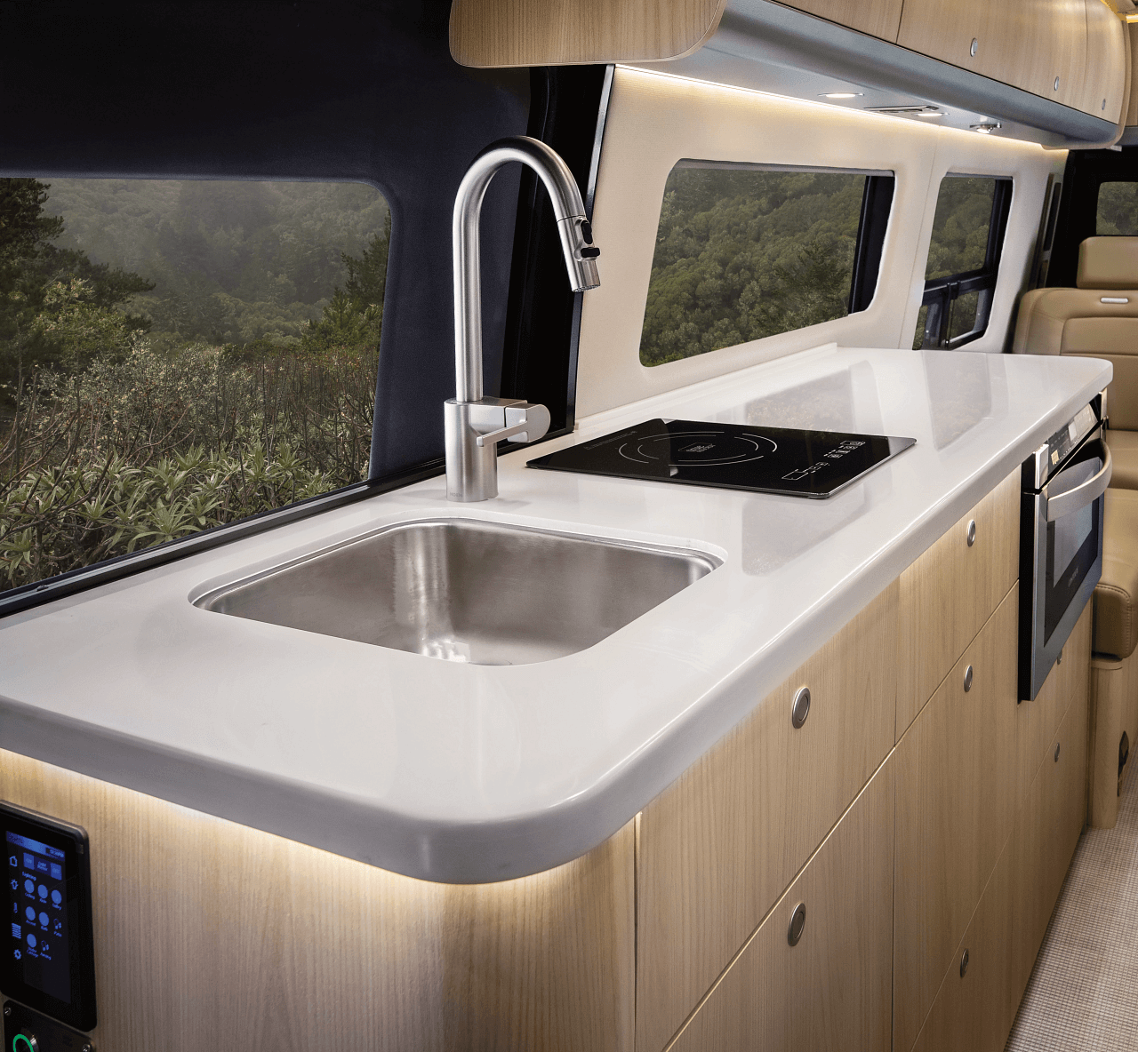 In the kitchen, the induction cooktop and convection microwave make cooking a hot meal convenient and straightforward. There’s ample counter space to prepare your ingredients and a deep stainless steel sink. A pantry, refrigerator with freezer, and deep drawers are all concealed and easy to pull out for quick snacks.